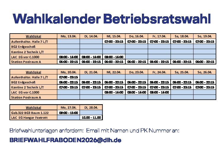 Gestern, am 26. Januar endete die Wiederholungswahl zum Betriebsrat DLH FRA Boden mit der Auszählung der Wählerstimmen mit folgendem Ergebnis:Liste 1: Team Admin…